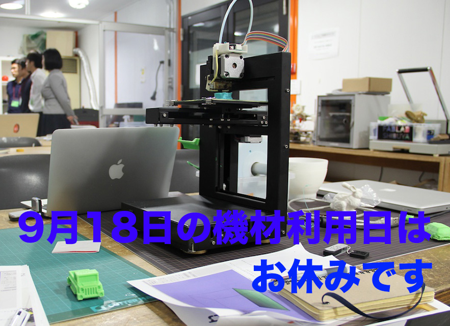 来週9月18日(水)は、工房の公式オープンスタジオを開催するため、機材利用をお休みいたします。
